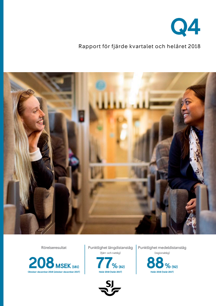 SJ avslutade 2018 i medvind. Under fjärde kvartalet ökade resandet med åtta procent, vilket återspeglades i intäkterna som blev högre än under motsvarande kvartal 2017. Det stora intresset för klimatsmart resande fortsatte att öka under året till totalt 31,8 miljoner resor med SJ, en ökning med 1,5 miljon jämfört med året innan. Ett nytt rekord.