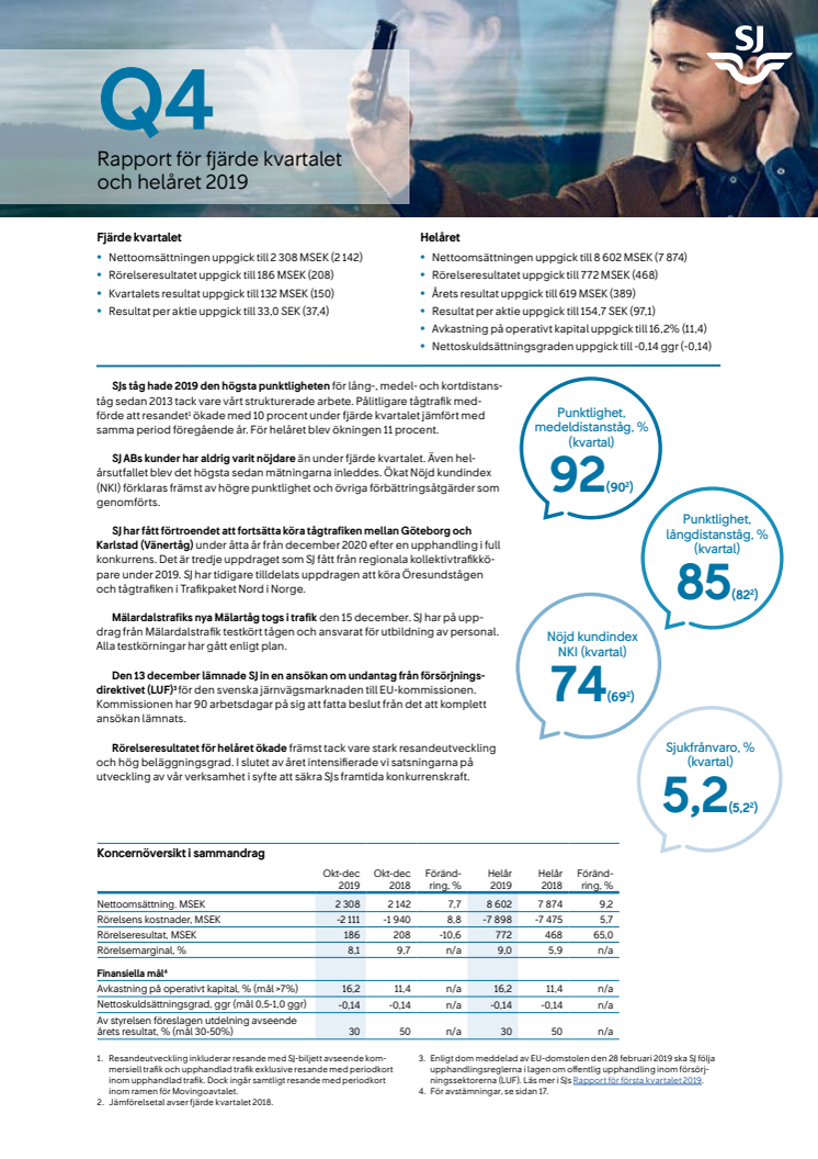 SJ har haft ett framgångsrikt år och presenterar i dag ett starkt resultat. För helåret 2019 blev resandeutvecklingen hela elva procent och under årets sista kvartal ökade resandet med tio procent. Många kunder värdesätter de många förbättringar som SJ gjort under flera år. Detta ledde till 34,3 miljoner sålda SJ-resor, en ökning med hela 2,5 miljoner resor jämfört med året innan.