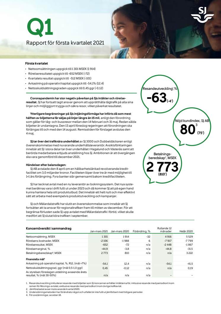 Resandet under årets första kvartal har legat på en fortsatt låg nivå med en förordning som begränsar hur många platser i tågen som kunnat säljas. SJ har fortsatt att ta ansvar för att genomföra trygga och klimatsmarta resor på samtliga linjer.