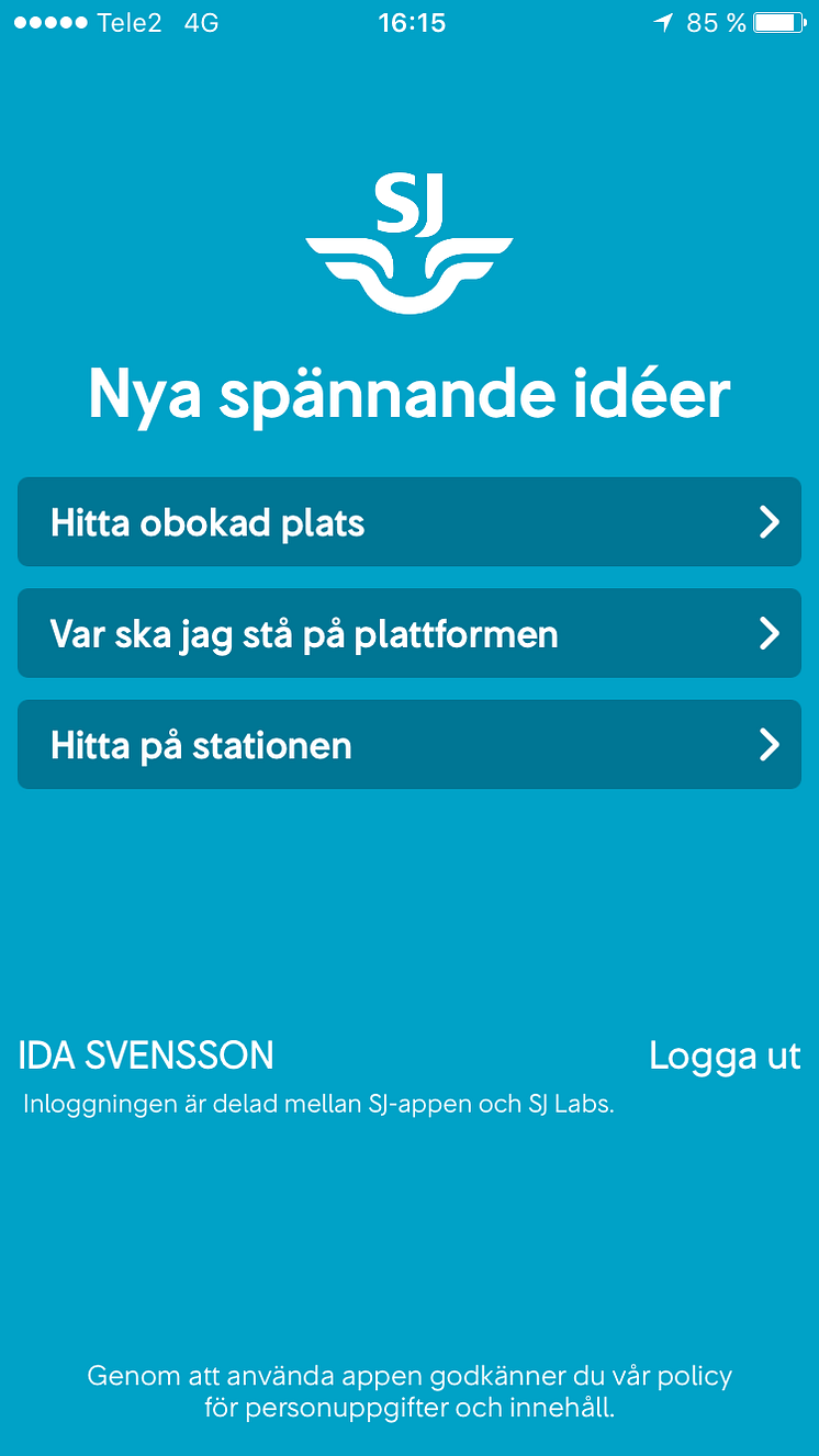 Skärmdump på SJ Labs-app där skärmdumpen visar förstasidan med den nya funktionen.