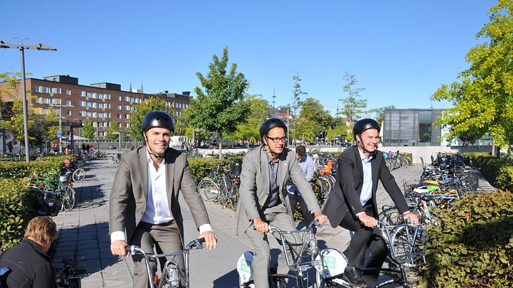 Bilden: Cykelsatsning. SJs vd Crister Fritzson, till höger, tog en premiärtur tillsammans med Uppsalas kommunalråd Stefan Hanna (i mitten) och Clear Channels vd Ola Klingenborg när SJ öppnade cykel-till-tågetstationerna i Uppsala. Foto: Gustaf Dahlbeck